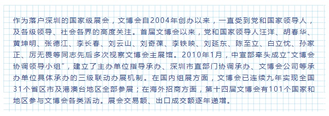 早在2003年,深圳就确立了文化立市战略目标,制定了一系列扶持推动文化产业发展的政策。2004年,在我国振兴和大力发展文化产业的大背景下,文博会应运而生,落户深圳。作为我国国家级、国际化综合性的文化产业博览交易会,深圳文博会成为推动中国文化走出去的重要平台。