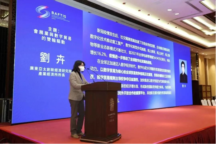 广东亚太创新经济研究院产业经济所所长刘卉发表《会展业与数字贸易的双轮驱动》主题演讲。